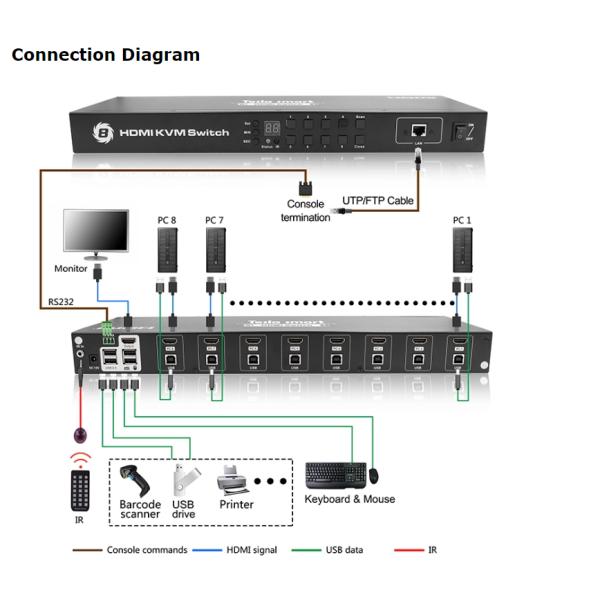 6.Support front panel buttons, IR signals, keyboard hot keys, RS232 serial commands(Optional) or IP commands(Optional) to control KVM switch
