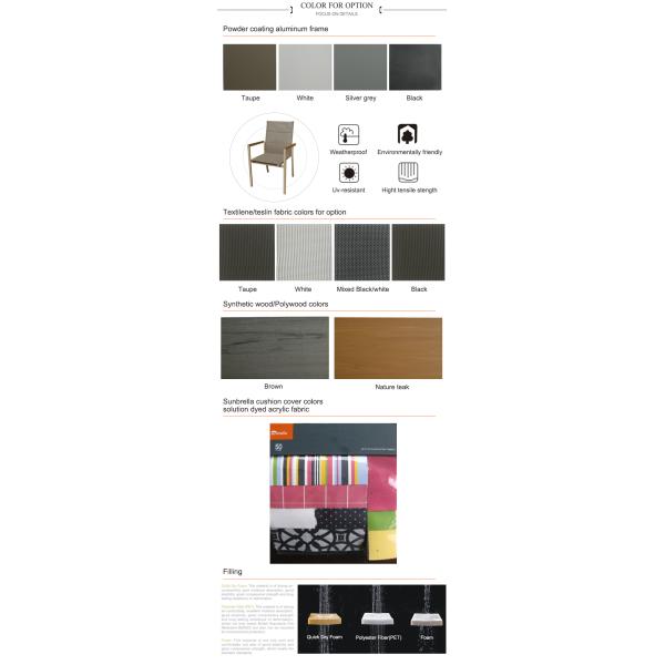 Our products are made of aluminum metal frame with powder coating treated, UV resisitant textilene/teslin fabric or TEAK wood or polywood or stainless steel etc.