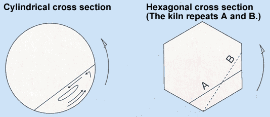 This machine is an indirect heating type of rotary kiln using electricity, heavy oil, or gas as the heat source. The shell, due to its equilateral hexagonal cross section, minimizes the "shear" of the material layer to provide a sharp distribution of residence time, enabling you to get stable and high quality products of uneven firing.